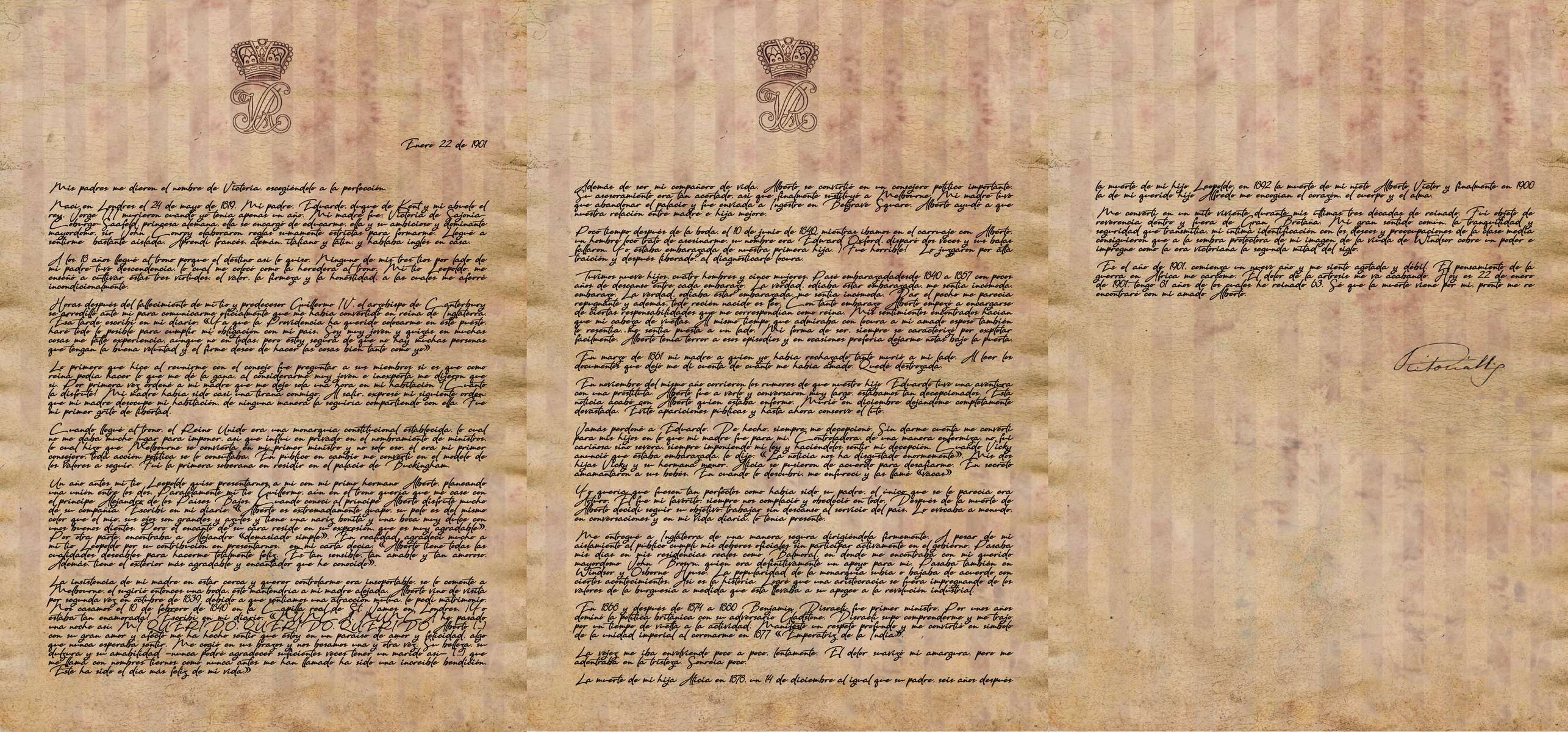 Es el año de 1901, comienza un nuevo año y me siento agotada y débil. El pensamiento de la guerra en África me carcome. El dolor de la artrosis me va acabando. Hoy es 22 de enero de 1901, tengo 81 años de los cuales he reinado 63. Sé que la muerte viene por mí, pronto me re encontraré con mi amado Alberto.